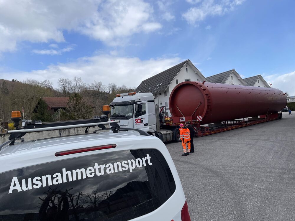 Der imposante Wärmespeicher wurde am Freitag, 27. März 2026 in Oberburg im Kanton Bern auf einen langen Tieflader geladen. In der Nacht auf Samstag erfolgte dann der anspruchsvolle Spezialtransport in den Kanton Aargau und am Folgetag die präzise Aufstellung mit einem grossen Pneukranwagen.