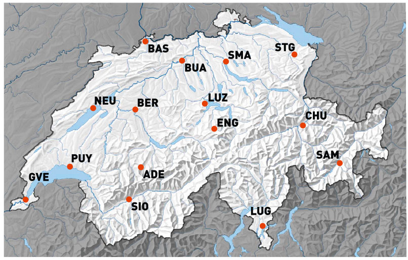 Schweizer Karte mit 15 Klimastationen (zu Tabelle Klimadaten Quartal)